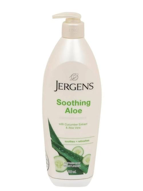 Jergens Soothing Aloe Refreshing Moisturizer is a lightweight, fast-absorbing body lotion designed to hydrate and soothe dry or sunburned skin, leaving it feeling soft and refreshed. Enriched with a blend of aloe and cucumber, this non-greasy formula is ideal for normal to dry skin types seeking daily nourishment.